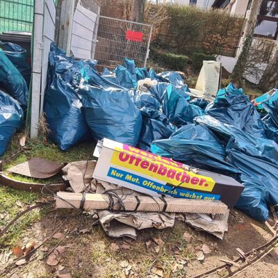 Ziemlich schnell merkten wir, dass der Müll vor allem abseits der Wege zu finden ist. Sowohl diverse Flaschen, die von geheimen Treffpunkten zeugten als auch jede Menge Plastik in unterschiedlichster Ausführung. Die Säcke füllten sich langsam. Unterwegs staunten wir auch über die Fundsachen anderer Sammelgruppen - Einkaufswagen, Kinderwagen oder auch das Metallgerüst einer halben Bank wurden von der illegalen Entsorgung zurückgeführt. In einer Straße am Wald fiel uns vor allem eins auf. Hecken am Straßenrand fordern die Menschen scheinbar dazu auf, Müll jeder Art darin zu abzuladen. „Das macht mich echt wütend“, verkündete Paul. Neben Kabeln, Joghurtbechern und weiteren Flaschen entdeckten wir auch einen Bohrmaschinenkoffer und einen ganzen Stapel Teppichfliesen, die wir aus nachvollziehbaren Gründen nicht mitschleppten, sondern direkt an den Mängelmelder der Stadt Offenbach weiterleiteten. Immer wieder kamen wir auch ins Gespräch mit vorbeilaufenden Spaziergängern oder Anwohnern, die uns großes Lob aussprachen und wissen wollten, von wem die Aktion sei. „Wir kommen von der TGS Bieber“, verkündeten die Kids voll Stolz.