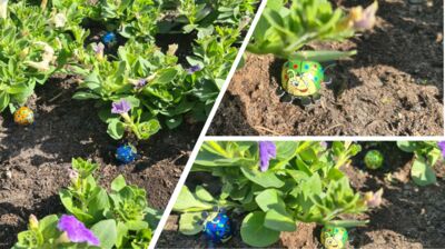Gleich im ersten Beet rasselten kleine Schokoeier und warteten darauf, gefunden zu werden. Die Schmetterlinge versteckten sich im hohen Gras auf der Wiese zwischen Löwenzahn und Gänseblümchen.