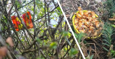 Ein Stückchen weiter hüpfte der Osterhase dann so heftig, dass viele Gummibärchentüten aus dem Korb in die Hecke geflogen und dort stecken geblieben sind. Schnell eingesammelt und dann weiter.