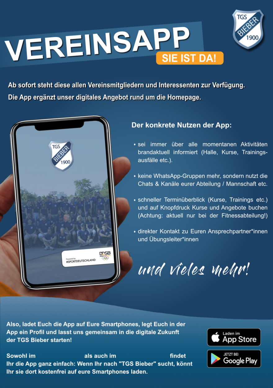 Wir versuchen in der Zukunft unsere Kommunikation zu unseren Mitgliedern weiter zu verbessern. Daher möchten wir dazu informieren, dass ab sofort unsere neue TGS Bieber App in den App-Stores heruntergeladen werden kann. Sucht einfach nach „TGS Bieber“ oder klickt auf folgende Links: