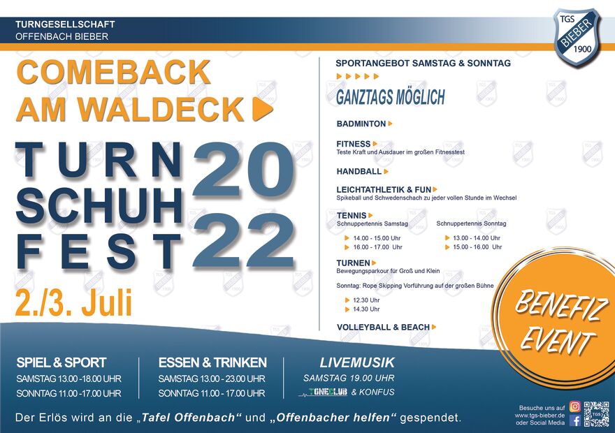 wie vor einigen Wochen bereits angekündigt, veranstalten wir am 2. und 3. Juli 2022 am Waldeck endlich wieder unser Turnschuhfest mit der gewohnten Mischung aus Spiel & Sport und geselligem Beisammensein. Wir laden euch alle sehr herzlich dazu ein! Bringt gerne eure Freunde und Bekannte mit und erzählt davon bzw. teilt den beigefügten Flyer.